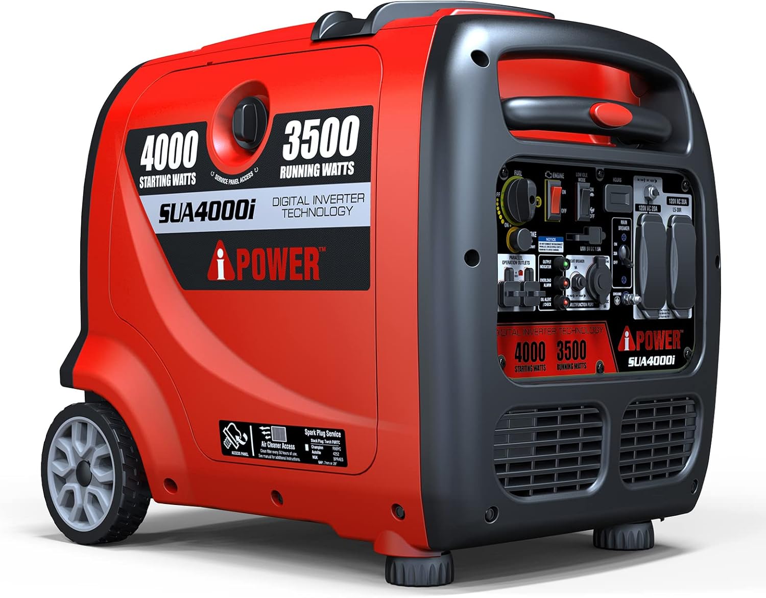 Image: The A-iPower SUA4000i portable inverter generator, showcasing konsepsyon kontra enfòmèl ant li yo ak panèl kontwòl li yo.