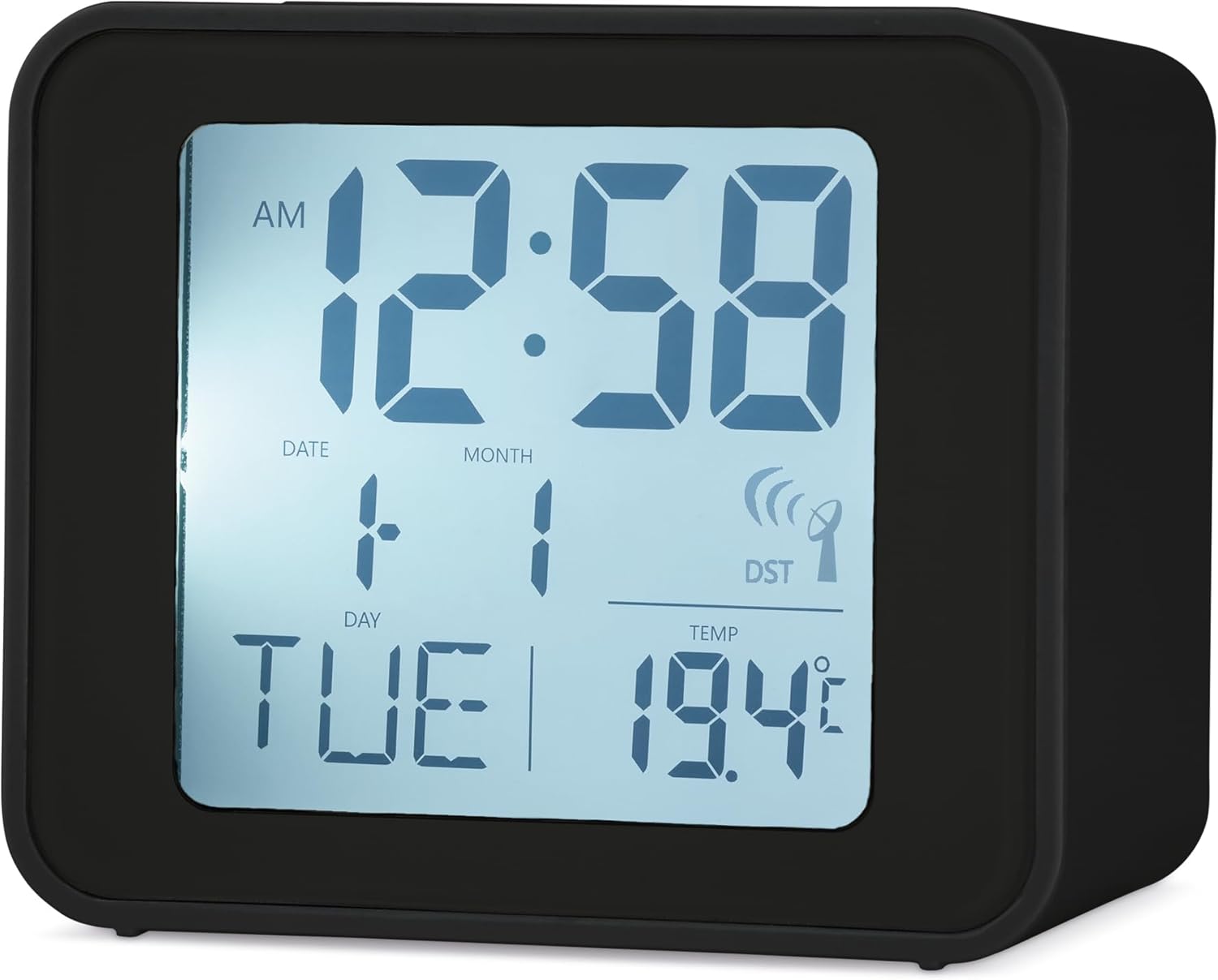 Figi 1: Devan view of the Acctim 71893 Cole Radio Controlled Alarm Clock, displaying the time, date, day of the week, and indoor temperature.