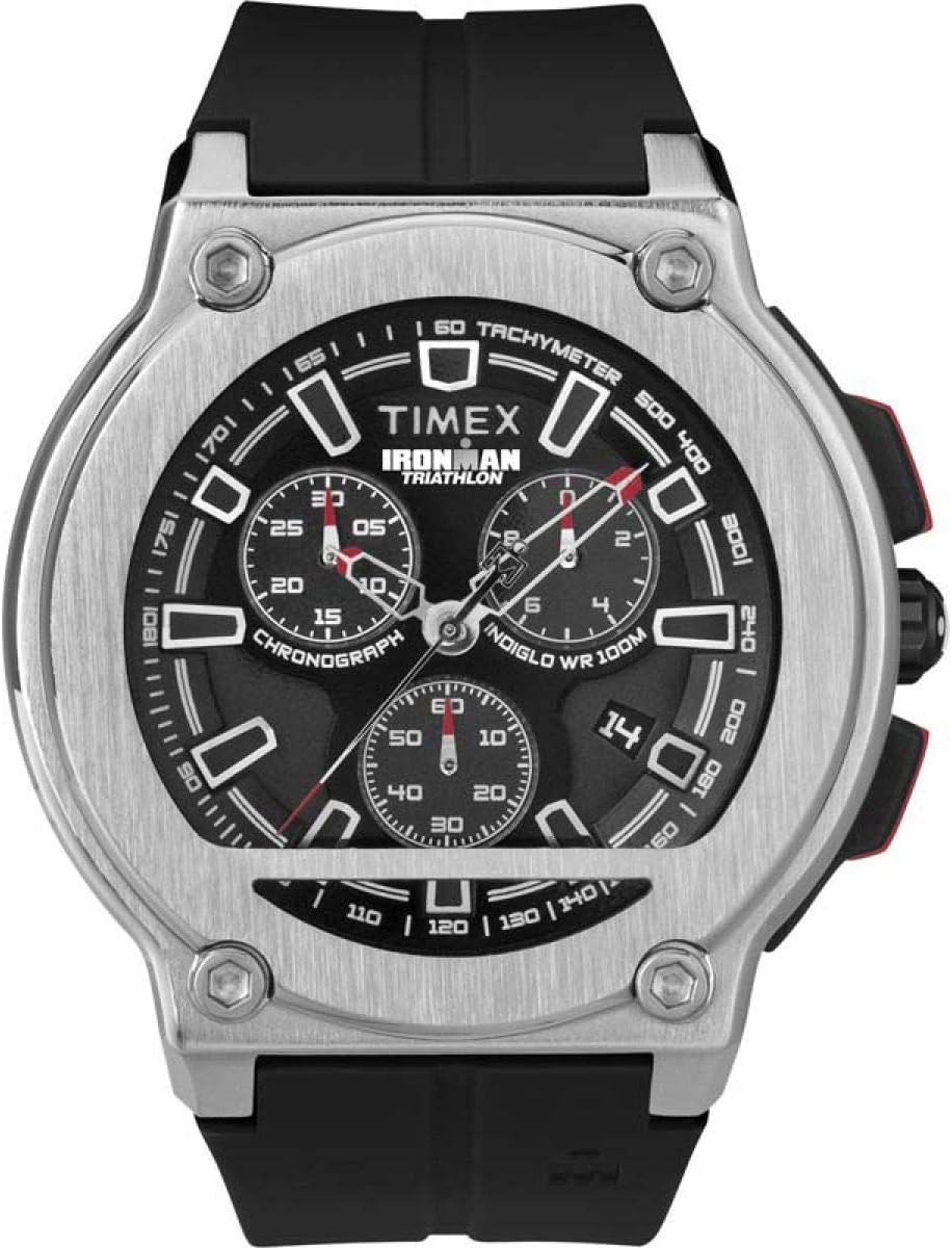 Figi 2.1: Mont Chronograph Timex Ironman Triathlon. Imaj sa a montre Mont Chronograph Timex Ironman Triathlon an. Li gen yon kadran nwa ak twa sou-kadran, zegwi limine, ak yon fenèt dat nan pozisyon 4 è. Mont lan gen yon bwat an asye pur ak vis vizib sou bezèl la ak yon braslè kawoutchou nwa. Kadran an montre tou mak 'TIMEX IRONMAN TRIATHLON' ak 'INDIGLO WR 100M'.