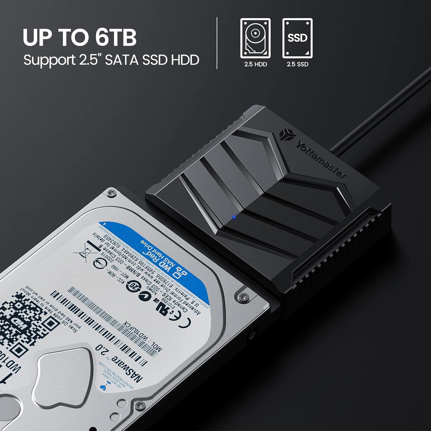 Image: Yottamaster SATA to USB 3.0 adapter connected to a 2.5-inch hard drive, illustrating its compatibility with 2.5-inch SATA SSDs and HDDs up to 6TB.