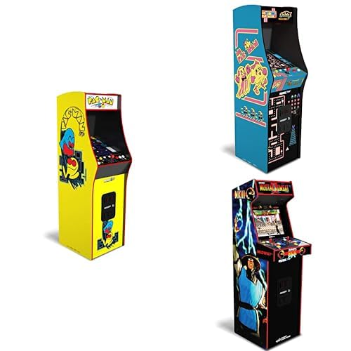 This image displays various Arcade1Up arcade cabinets, including the iconic yellow PAC-Man cabinet, a blue Ms. Pac-Man cabinet, and a dark Mortal Kombat II cabinet. Each cabinet features distinct artwork and controls, representing the classic arcade experience.