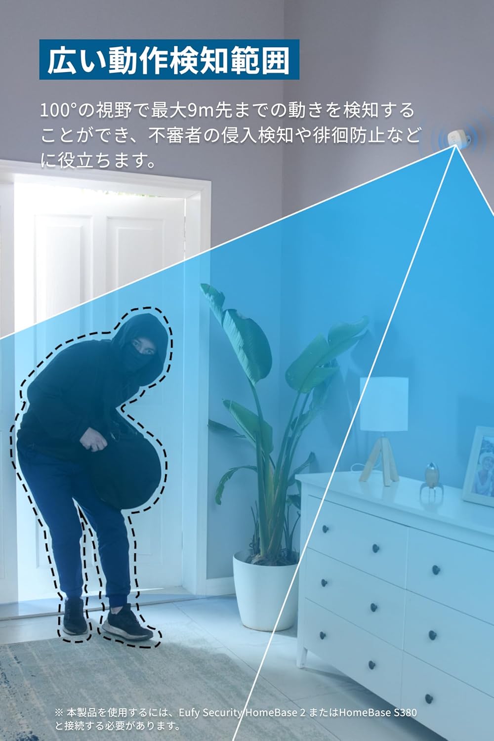 Image: The Eufy Security Motion Sensor detecting a person entering a room, highlighting its wide detection range.