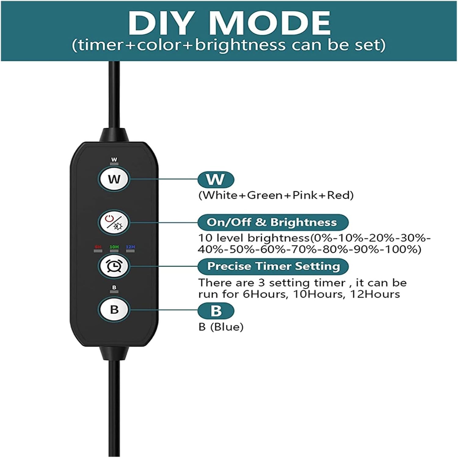 Figi 4: DIY Mode explanation. This diagram visually explains how to set the timer (6H, 10H, 12H), adjust brightness (10 levels), and control the 'W' (White+Green+Pink+Red) and 'B' (Blue) LED channels.